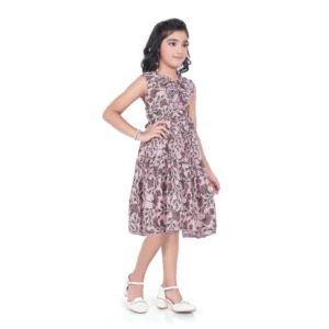 Generic Girl’s Digital Slub Printed Sleeve Less Round Neck Dress (Brown)