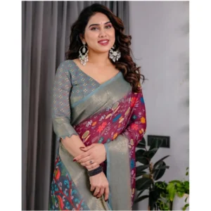 Women’s Linen Printed Saree With Unstitched Blouse 5.5Mtr