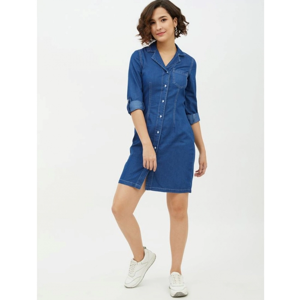 Generic Women’s Denim Solid Long Sleeves Above Knee Dress (Blue)