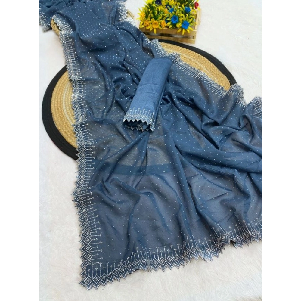 Generic Women’s Georgette Stone Work Saree With Unstitched Blouse 5.5Mtr (Grey)