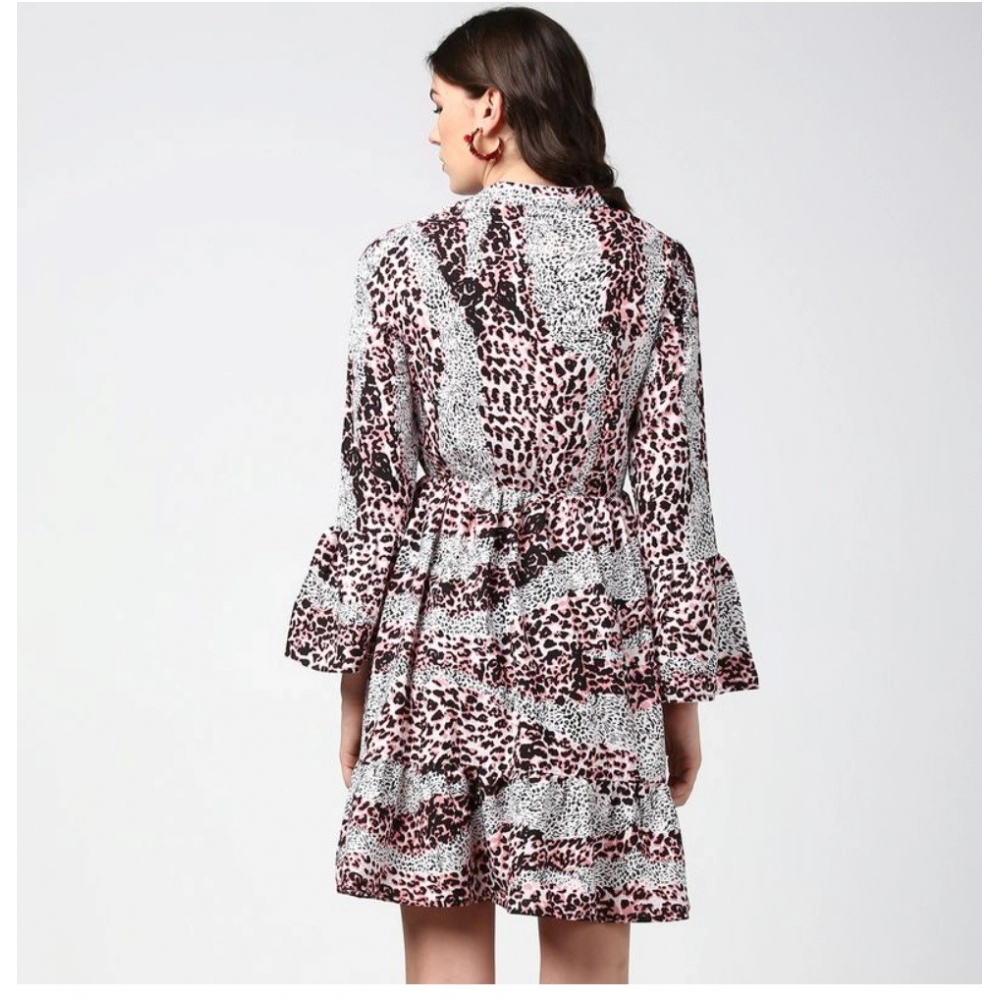 Generic Women’s Polyester Animal Print Bell Sleeve Above Knee Dress (Pink – Black)