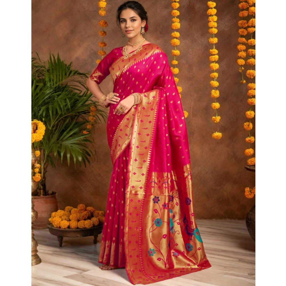 Generic Women’s Silk Blend Zari Weaving Saree With Unstitched Blouse 5.5Mtr (Pink)