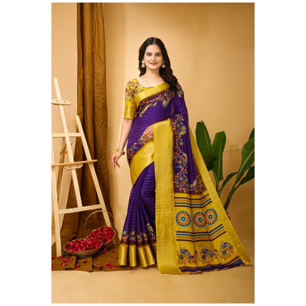 Generic Women’s Soft Dola Cotton Kalamkari Printed Saree With Unstitched Blouse 5.5Mtr (Purple)